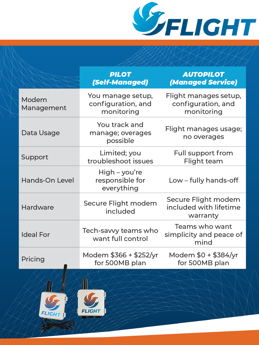 Flight Pilot is a self-managed modem solution for teams who want full control over their connectivity. You handle setup, configuration, monitoring, and ongoing management while still benefiting from secure, reliable Flight modem hardware and data service. Pilot offers the flexibility to manage your own environment while maintaining dependable performance.