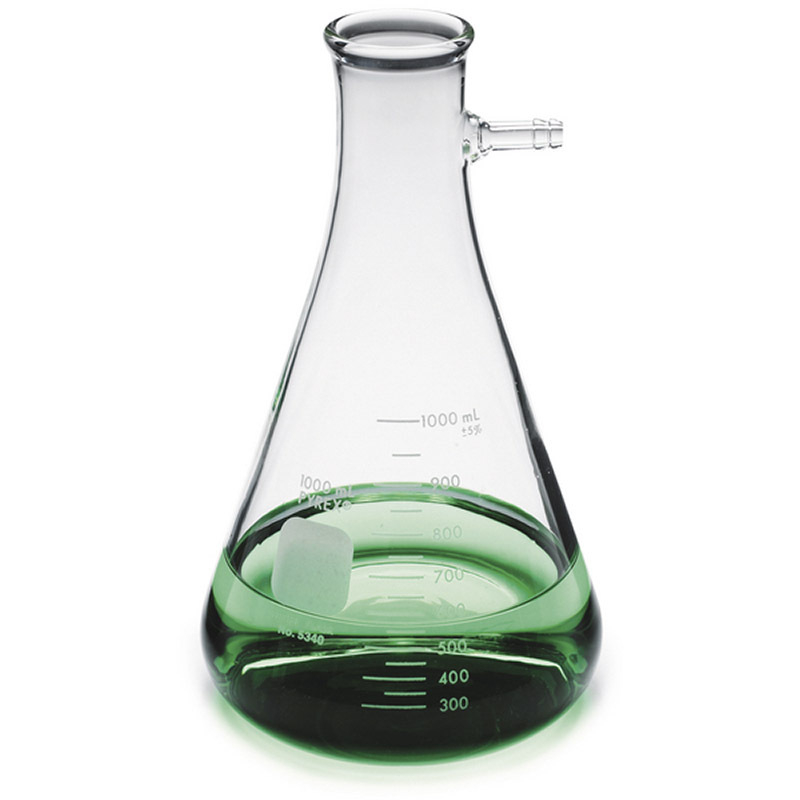 Glass filtering flask with side-arm at 90° angle. Heavy-walled with graduated capacity scale. Designed to ASTM E1406, Type II, Class I requirements. Hose connection accepts 5/16" I.D. flexible tubing.