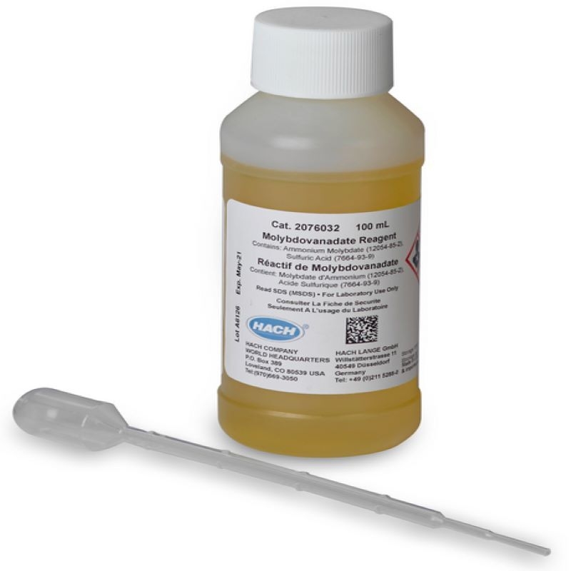 For phosphate (phosphorus) determination by the Molybdovanadate Method: Hach method 8114. Range: up to 45.0 mg/L PO?. 100 mL bottle