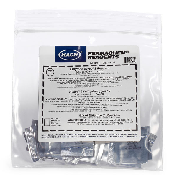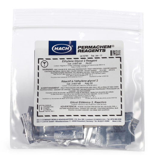 For presence/absence detection of glycols by visual test kit. Replacement reagent for Hach Glycol Detection Test Kit - 2186400. Pack of 25 Powder Pillows.