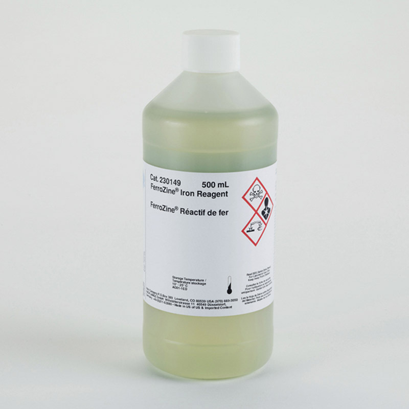For determination of trace levels of iron by the Ferrozine method. Hach Method 8147. Range: 0.009 to 1.40 mg/L. Sample: 25 mL. 500 mL bottle.