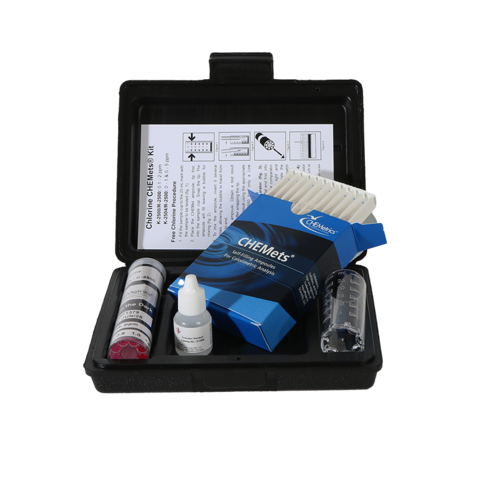 Our CHEMets Free and Total Chlorine Test Kit (K-2500) comes in a plastic case and contains everything needed to perform 30 tests: Refill, Low Range Comparator, Activator Solution, 25 mL sample cup, and instructions.