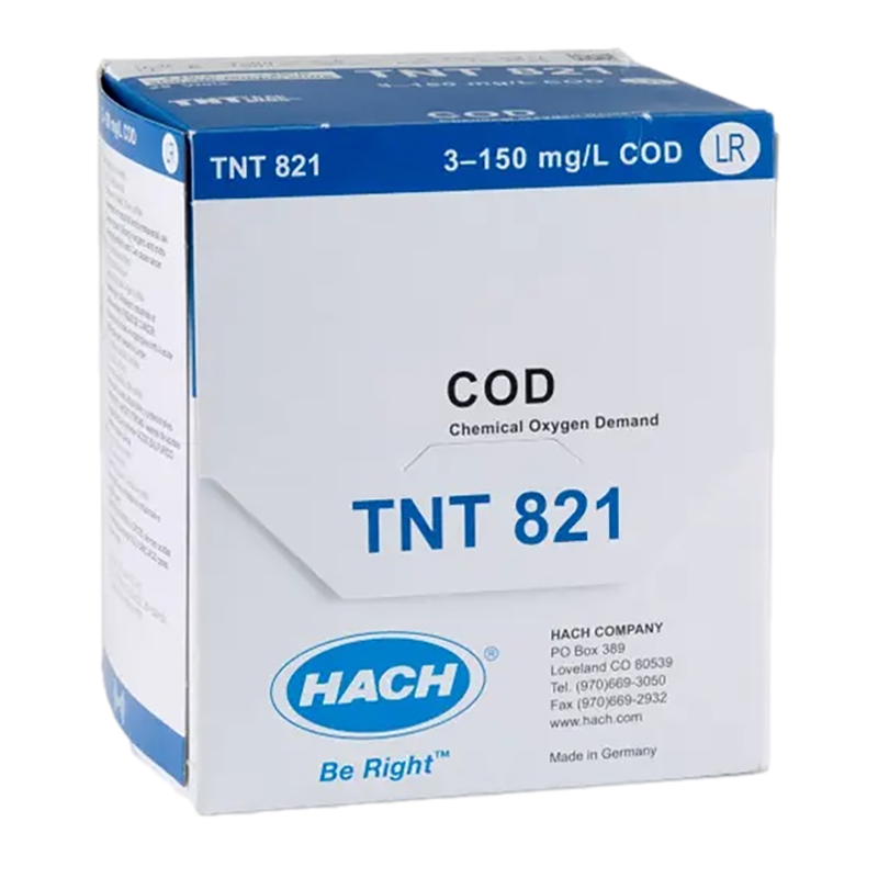 Hach TNTplus COD vial test reagents are incredibly simple to use and cut down significantly on waste generation compared to other COD test kits. TNT821 is based on Hach Method 8000 for virtually any type of water sample. Method 8000 is USEPA approved for wastewater analysis under 40 CFR 136.3 and based on Standard Methods 5220 D.