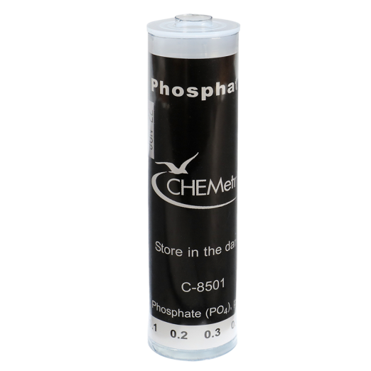 C-8501 Low Range Phosphate, ortho Comparator is a component of K-8510 Phosphate,ortho CHEMets Visual Test Kit and is designed to be compared against the color formed in R-8510 Phosphate, ortho CHEMets Refill. The comparator’s range is applicable to many environmental and water treatment applications. Color standards are blue in color and cover a range of 0-1.0 ppm PO4.