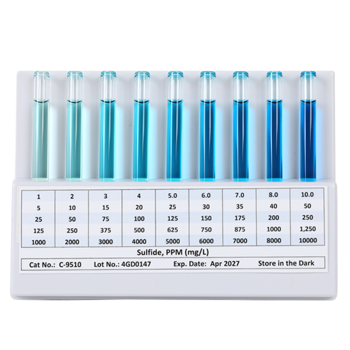 The C-9510 Flat Sulfide Comparator is a component of K-9510, K-9520D, K-9520A, K-9520B, K-9520C, and K-9520D sulfide test kits. It is designed to be compared against the color formed in R-9510 Sulfide CHEMets® Refill. The comparator's range is applicable for many industrial water, wastewater, and environmental water quality applications. The color standards contain blue dye mixtures that are formulated to match the colors produced by the test ampoules.