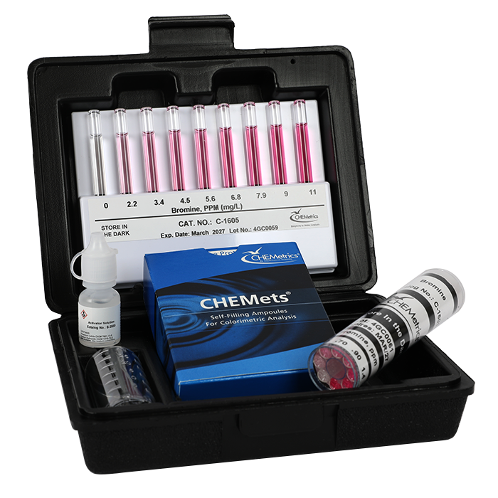 The K-1605 Bromine CHEMets® Test Kit comes in a plastic case and contains everything needed to perform 30 tests. CHEMets® Refill, Flat and Round Comparators, Activator Solution,and 25 mL sample cup.