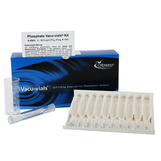 The Phosphate Vacu-vials® Instrumental Test Kit (Catalog No. K-8503) provides accurate measurement of orthophosphate in water using the vanadomolybdophosphoric acid method. Covering a range of 0–80.0 ppm, this kit is designed for instrumental analysis with CHEMetrics Direct-Readout Photometers or spectrophotometers that accept 13 mm round cells. Each kit includes all reagents needed to perform 30 tests, making it ideal for laboratory or regulated water testing. Instrument sold separately.