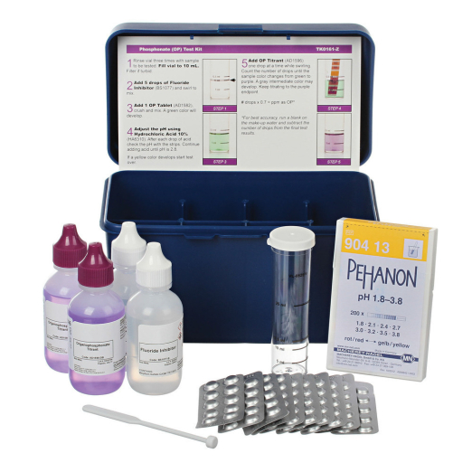 This modified phosphonate test kit compensates for high-alkaline waters and possible fluoride interferences. This kit includes an acid reagent and pH paper to adjust the sample to the correct 2.8 pH and a fluoride suppressor reagent.