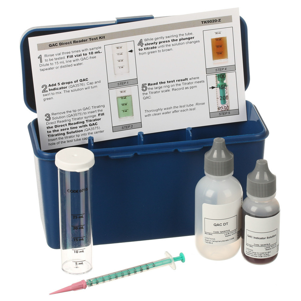 Contains: QAC Titrating Solution 60 mL, QAC Indicator Solution 30 mL, Direct Reading Titrator, Test Tube Plastic
